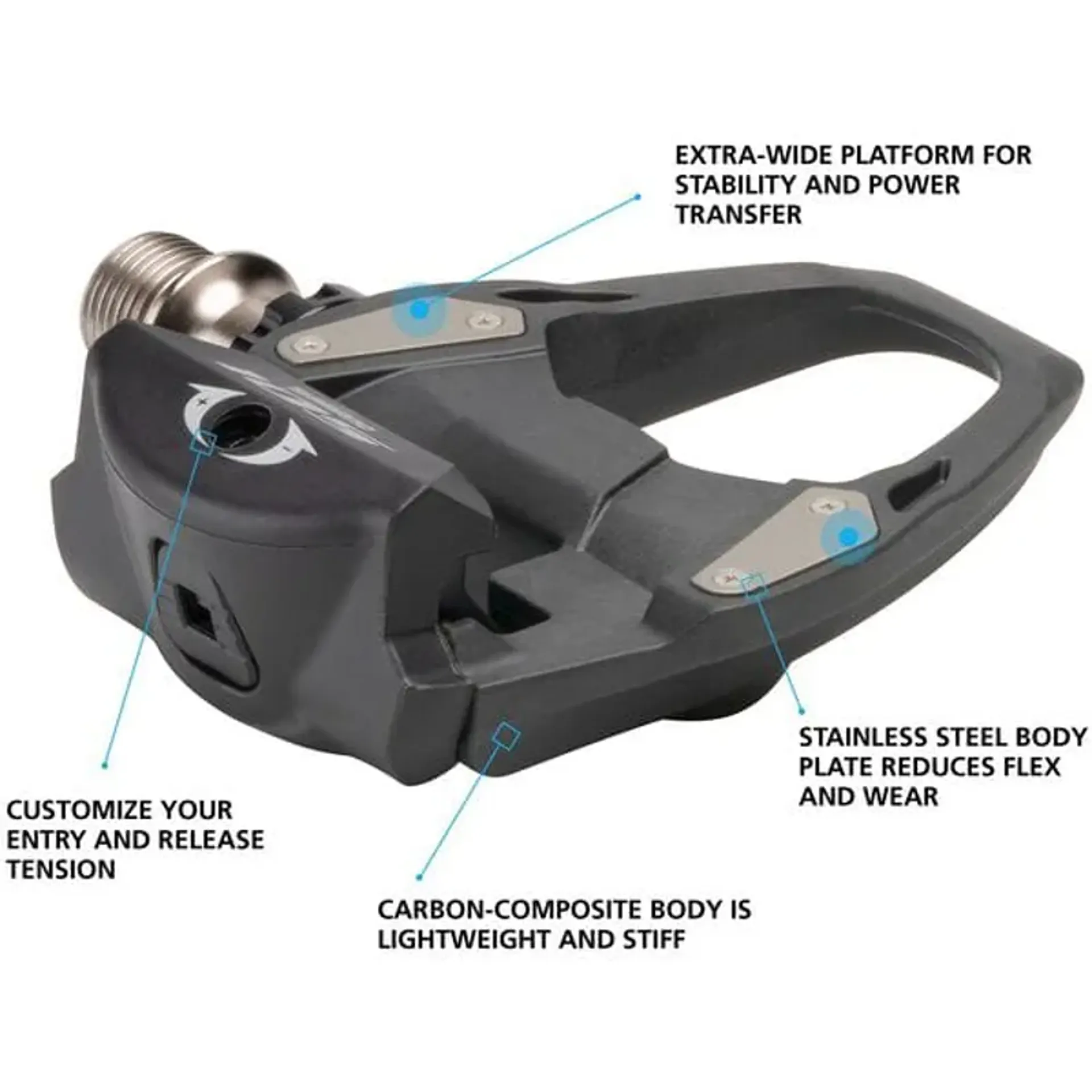 • large binding target allows quick engagement while wide cleats provides more efficient pedalling